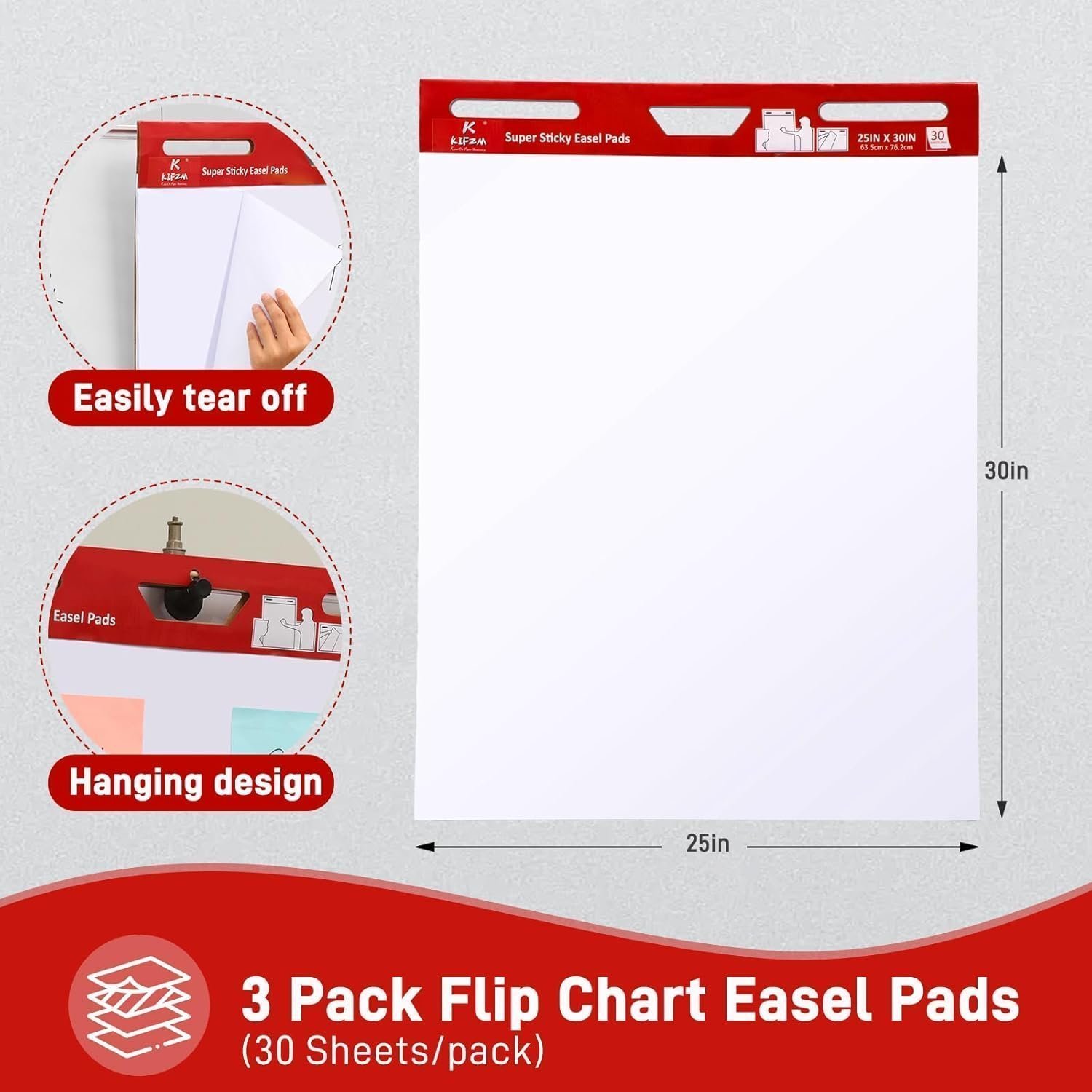 3 Pads-Large Sticky Easel Pad, 25×30 Inches White Self Stick Flip Chart Paper for Office Team Work School Classroom Supplies – 635mm x 762 mm,30 Sheets/Pad