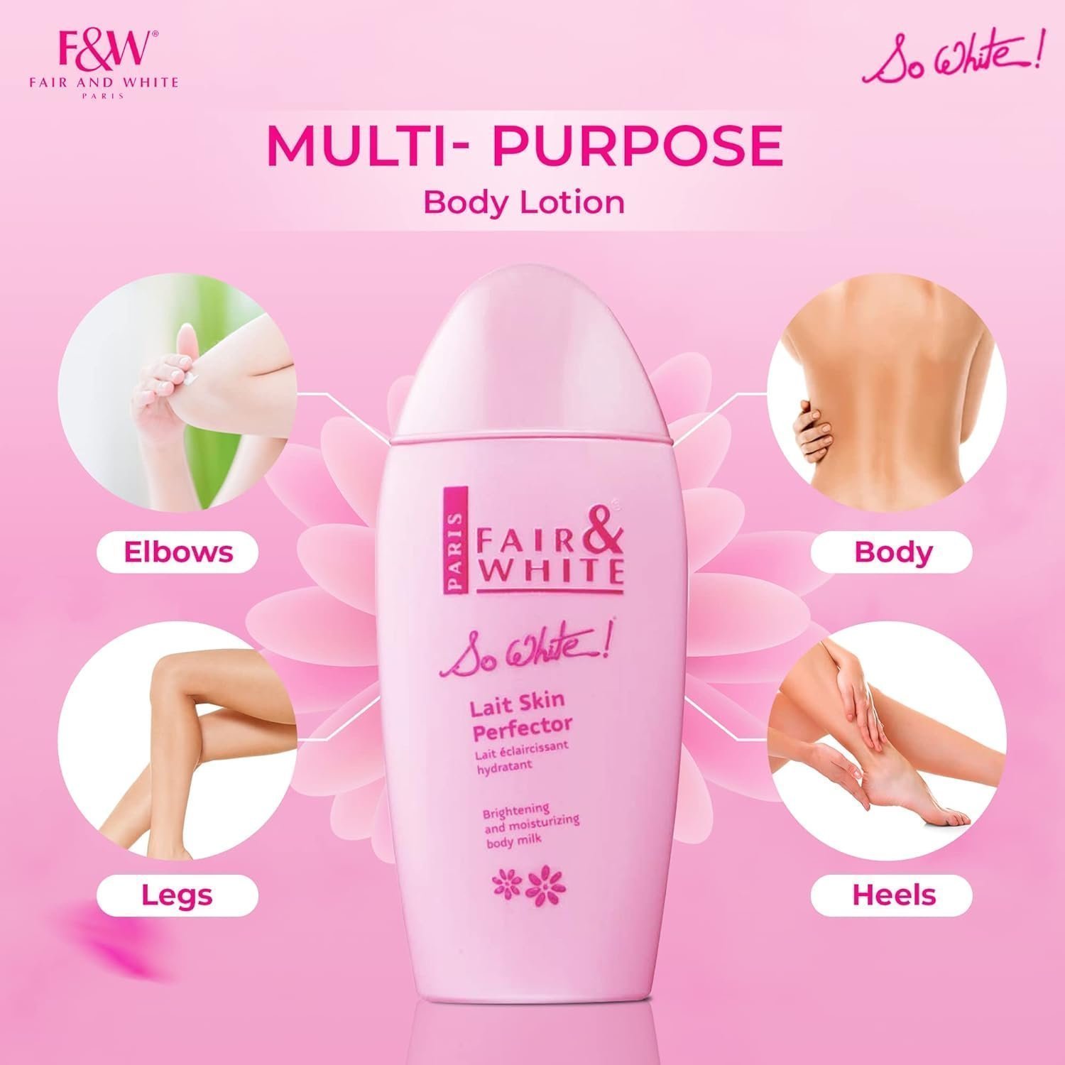 - FAIR & WHITE SO WHITE: It has been designed for today’s modern young women wanting to pamper and rejuvenate their skin. With its bright pink, feminine packaging, So White! skincare fulfills every woman’s wish. With a wide range of face and body skincare that holds a sweet and delectable scent, So White! delicately smoothes skins texture, enhancing skins radiance.