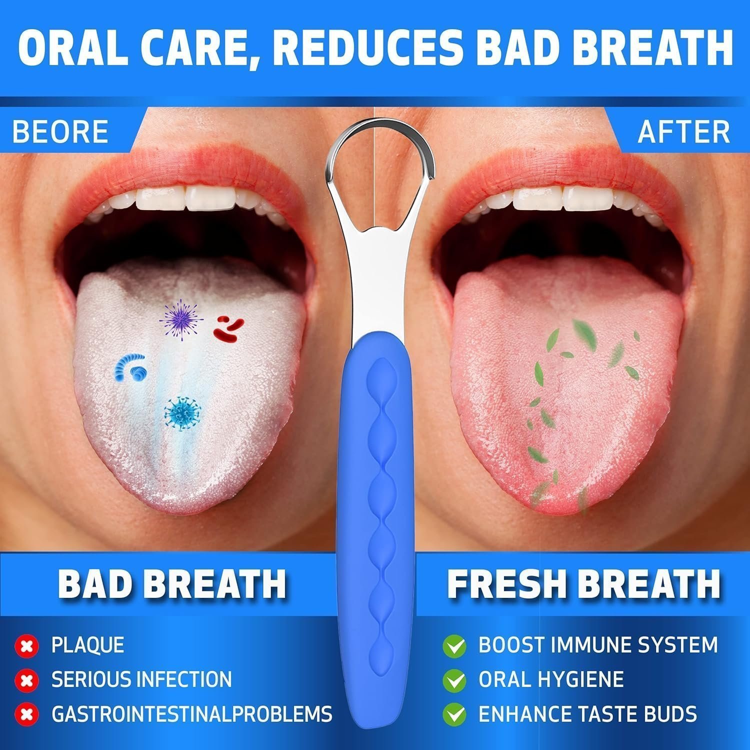 - It Can Do What for You: If you had bad breath for several years, but didn’t know what causes it. Use brush, floss more and more, but none of that ever worked. You can’t imagine how dirty our tongue was until using the tongue scraper. However, we know that why we have bad breaths and always feel food tasteless. The scrapers are super easy to use and get the entire tongue clean of all your grossness, make your taste sensible. Cheers to waking up without horrid morning breath, enjoy every meal.