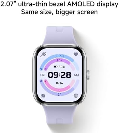 - [Ultra-thin bezel] Same size, bigger screen. 2.07″ AMOLED display, 60Hz high refresh rate, and Stainless-steel rotating crown.