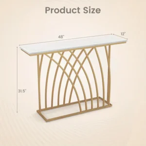 £164The TANGKULA 48″ Gold Console Table combines modern design with functionality. Featuring a stunning white faux marble tabletop and a geometric gold base, this narrow console table is perfect for entryways, hallways, or behind sofas. It offers ample space for decorative items or storage, with a closed storage capacity of under 3.2 cubic feet. Its light yellow finish adds a touch of elegance, while the sturdy wood construction ensures durability. Whether for modernizing your living room or enhancing your hallway, this console table brings both style and practicality to any space.